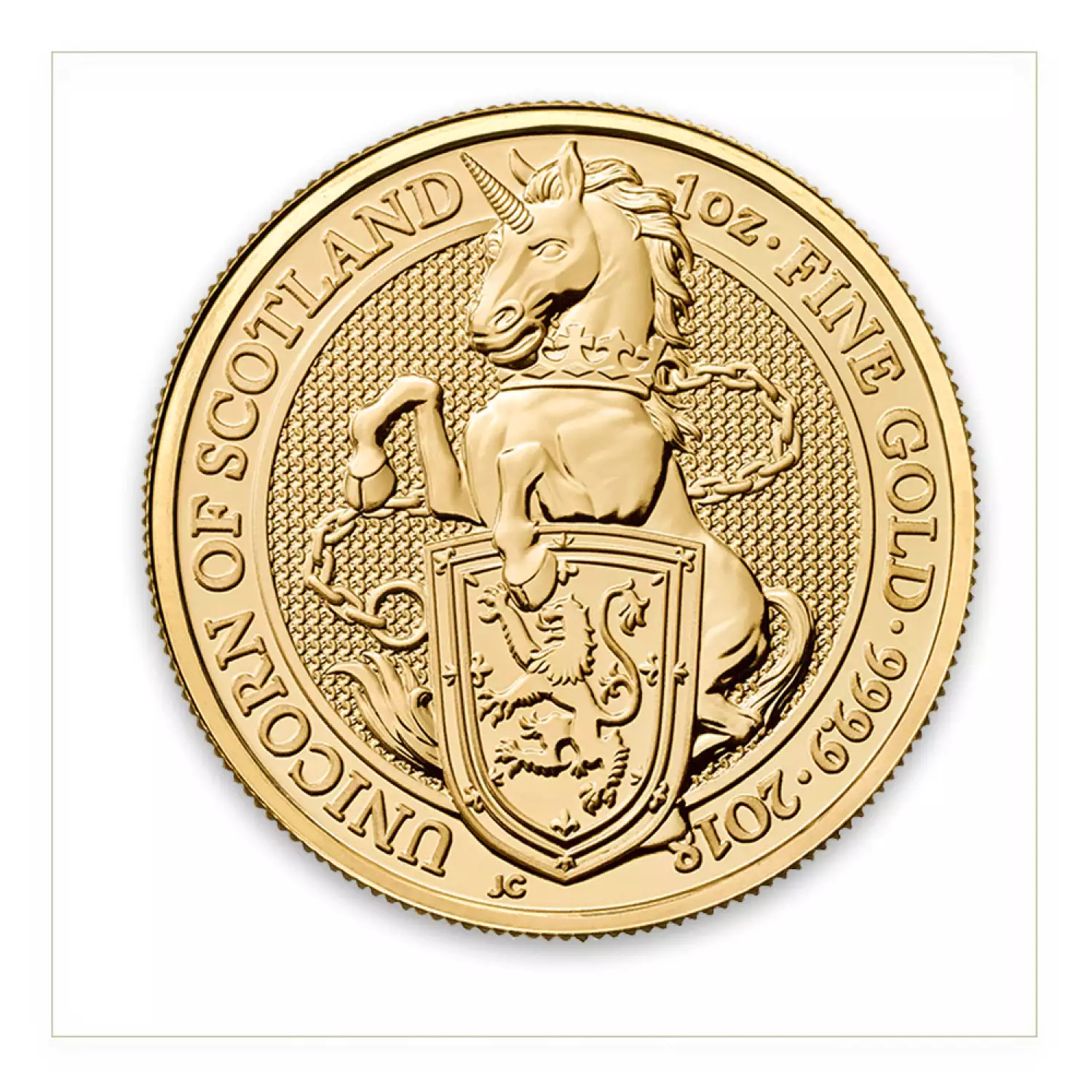 The 1 oz 2018 Britain Queen's Beast: The Unicornis the fourth release in the Queen's Beasts series, featuring the Unicorn of Scotland.