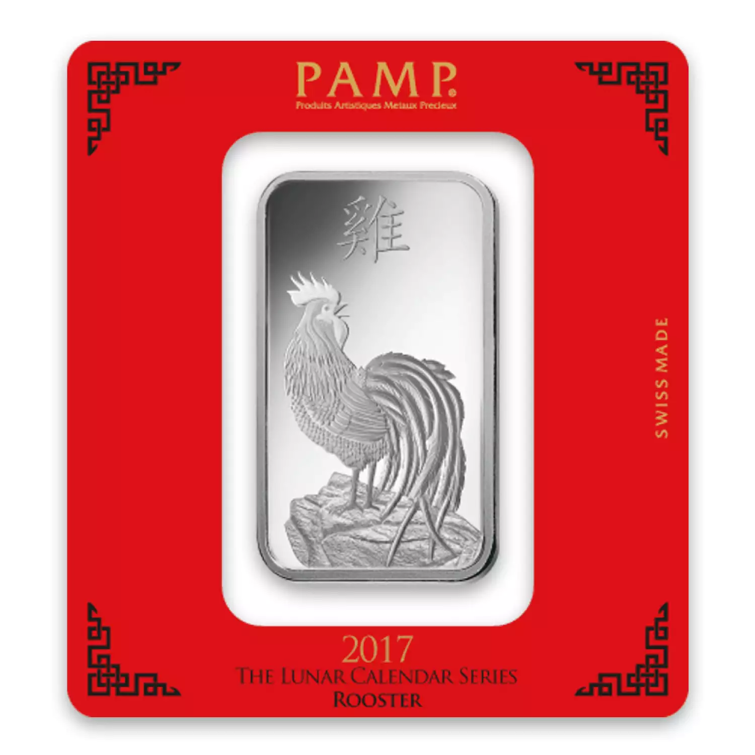Buy the high-quality 100 grams PAMP Silver Bar - Lunar Rooster today from us online! The silver price is updated on our website every minute.