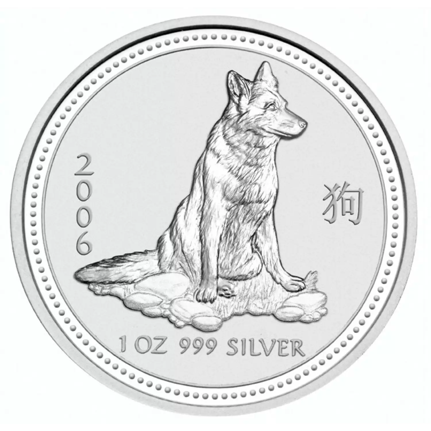 The 2006 1oz Australian Perth Mint Silver Lunar: Year of the Dog is composed of 1 troy ounce of .999 fine silver and has a low mintage.