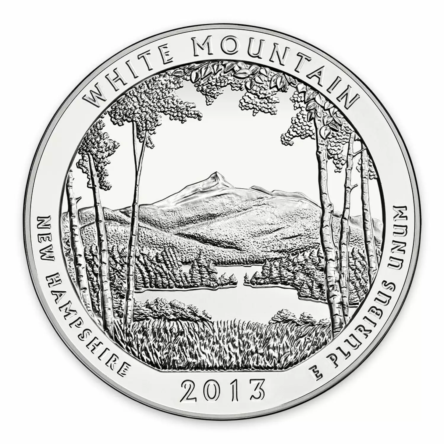 Since 2010, the US Mint released five silver America the Beautiful coins annually. The 5oz silver coins will be complete in 2021, each representing a historical monument or a treasured national park. These bullion coins were introduced following the success of the state quarter program.The White Mountain National Forest (WMNF) is a federally managed forest contained within the White Mountains in the northeastern United States. It was established in 1918 as a result of the Weeks Act of 1911;federal acquisition of land had already begun in 1914.