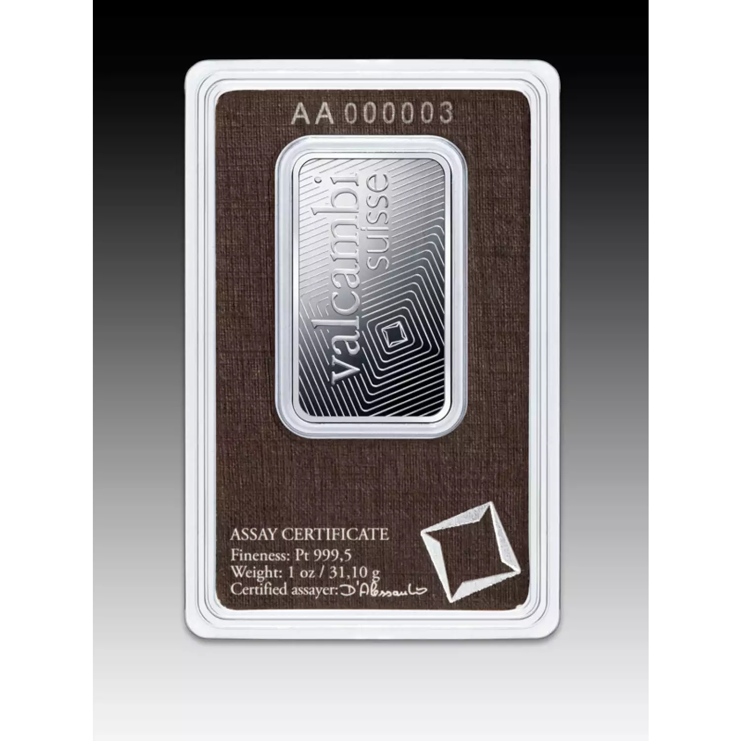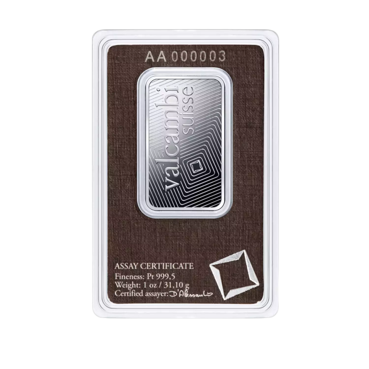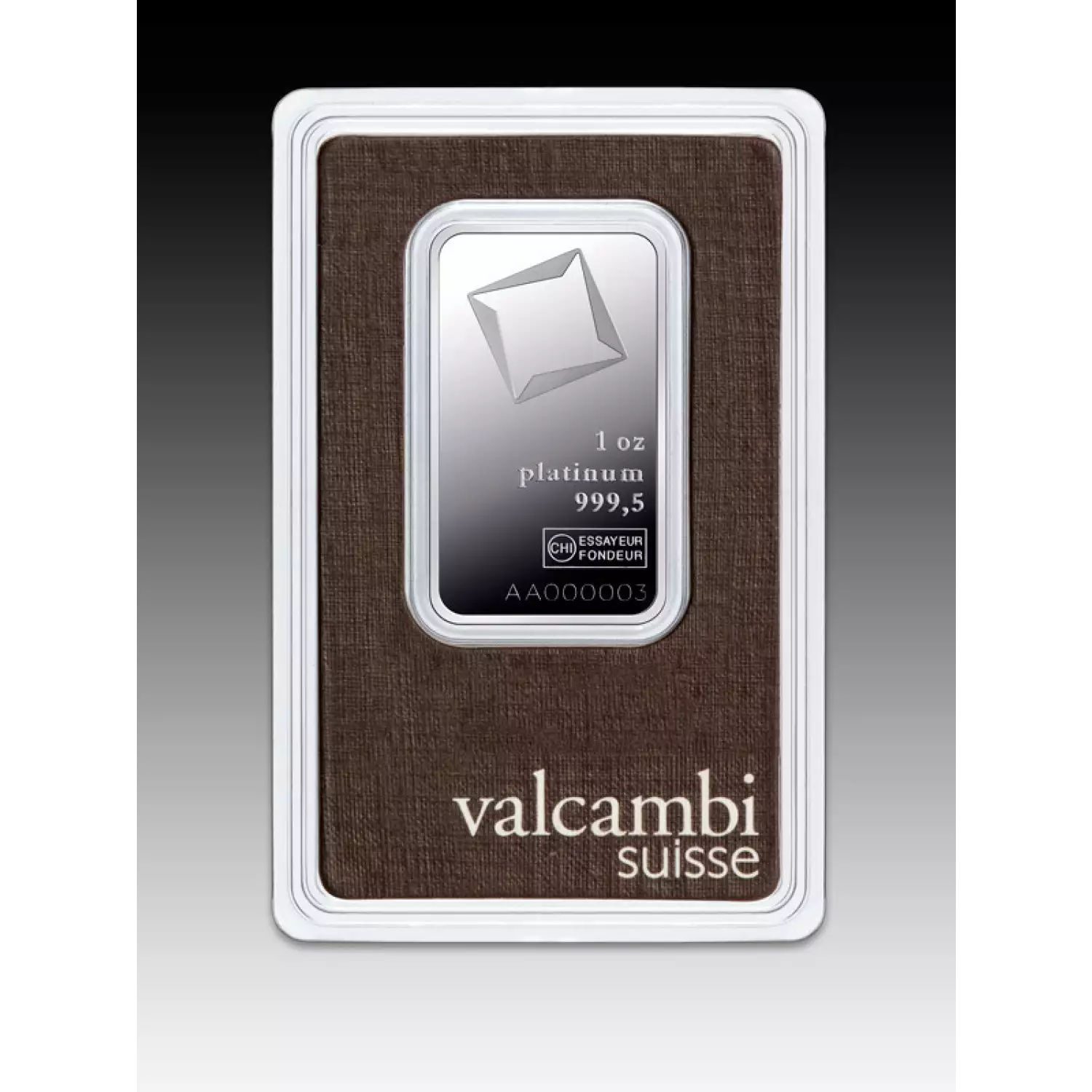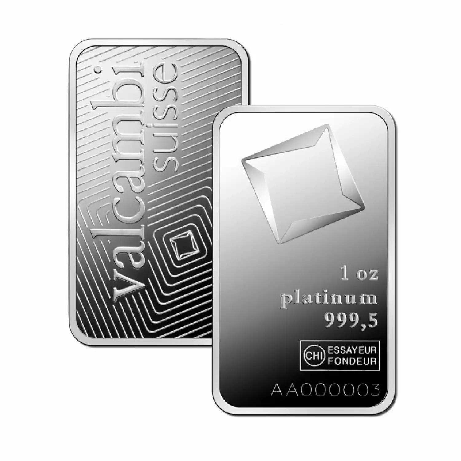 Valcambi Suisse is one of the oldest Swiss refineries, popular for minting high-quality bars. The 1oz Valcambi Minted Platinum Bar contains 1 troy ounce of .9995 pure platinum, features the Valcambi corporate logo. This strikingly beautiful platinum bar is designed by Valcambi Suisse.