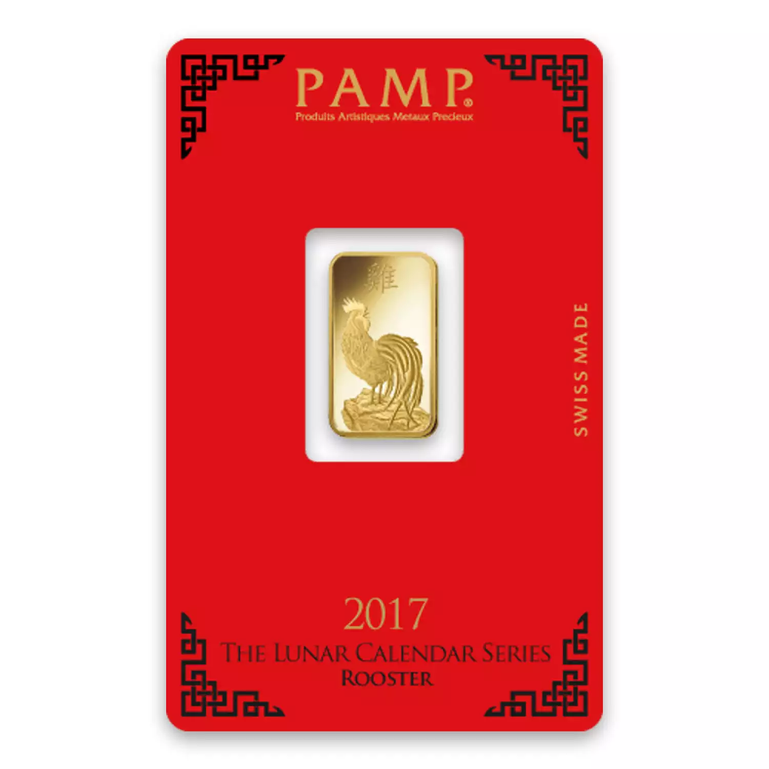 2017 is the Year of the Rooster on the Chinese Lunar Calendar. The 5g PAMP Gold Bar - Lunar Rooster features the image of a rooster proudly looking over its right shoulder on its obverse. Above the image, the Chinese symbol for rooster is stamped.