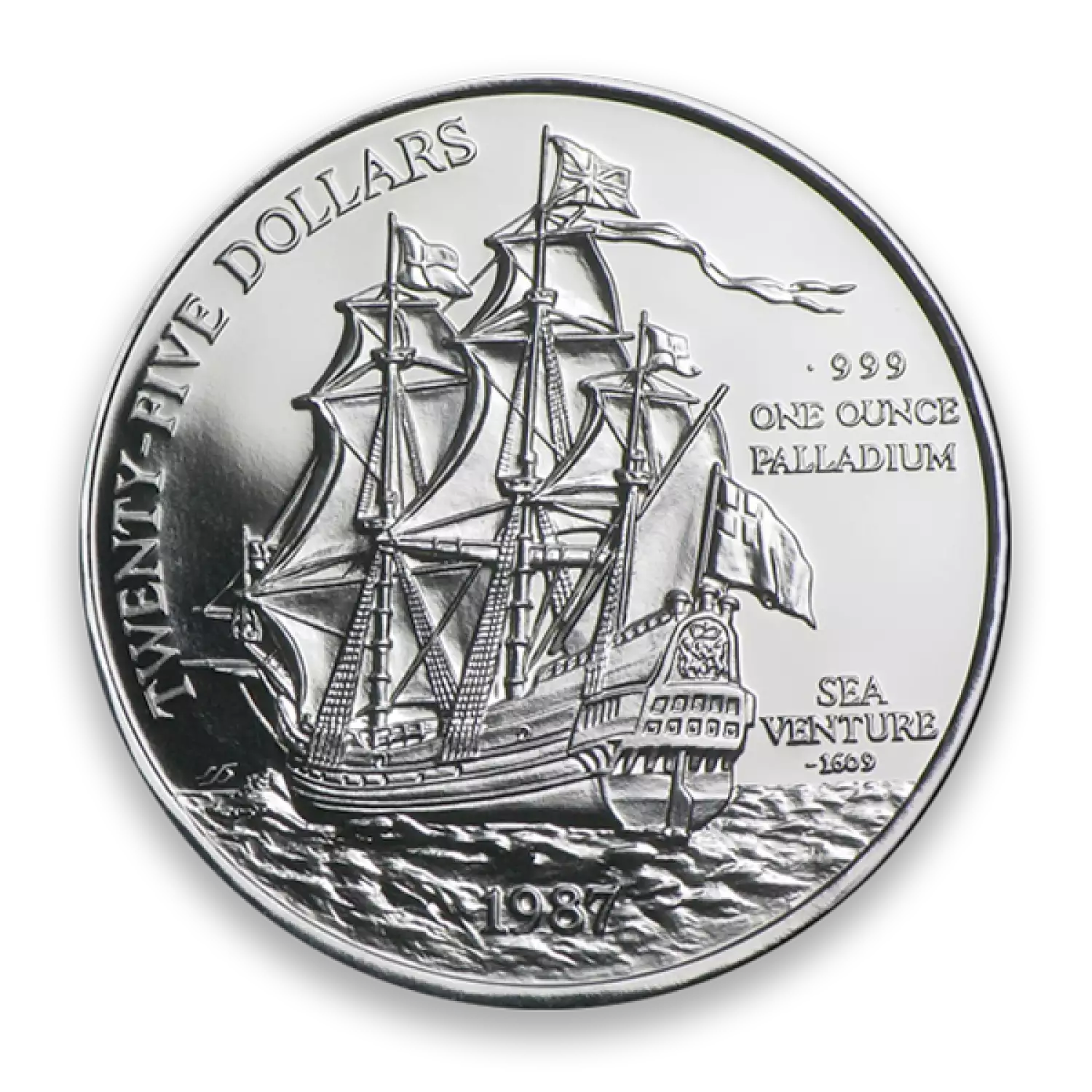 The Bermuda 1oz Palladium Sea Venture depicts a stunning rendition of the sea venture sailing ship and has a mintage of just 15,000 coins. Each Bermuda 1 oz Palladium Sea Venture contains 1 troy ounce of .999 fine palladium.