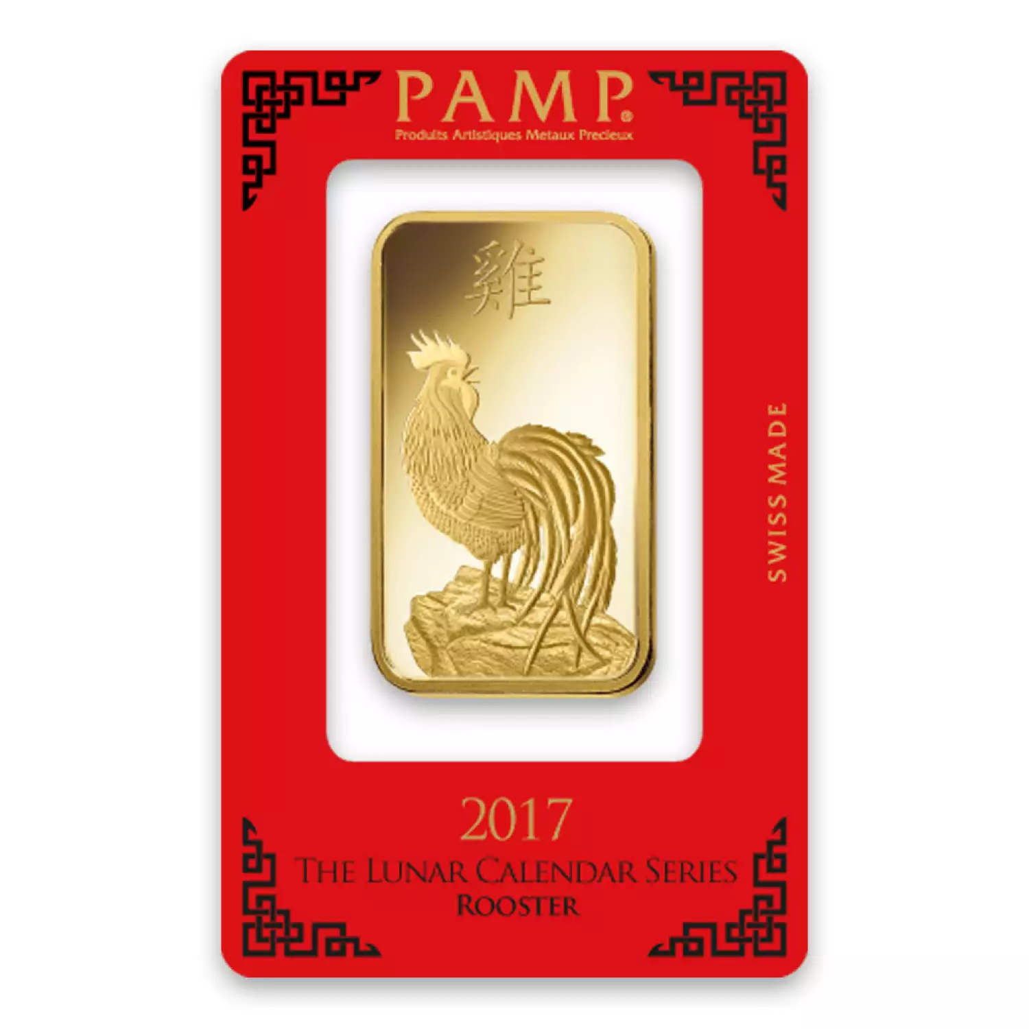 2017 is the Year of the Rooster on the Chinese Lunar Calendar. The 100g PAMP Gold Bar - Lunar Rooster features the image of a rooster proudly looking over its right shoulder on its obverse. Above the image, the Chinese symbol for rooster is stamped.