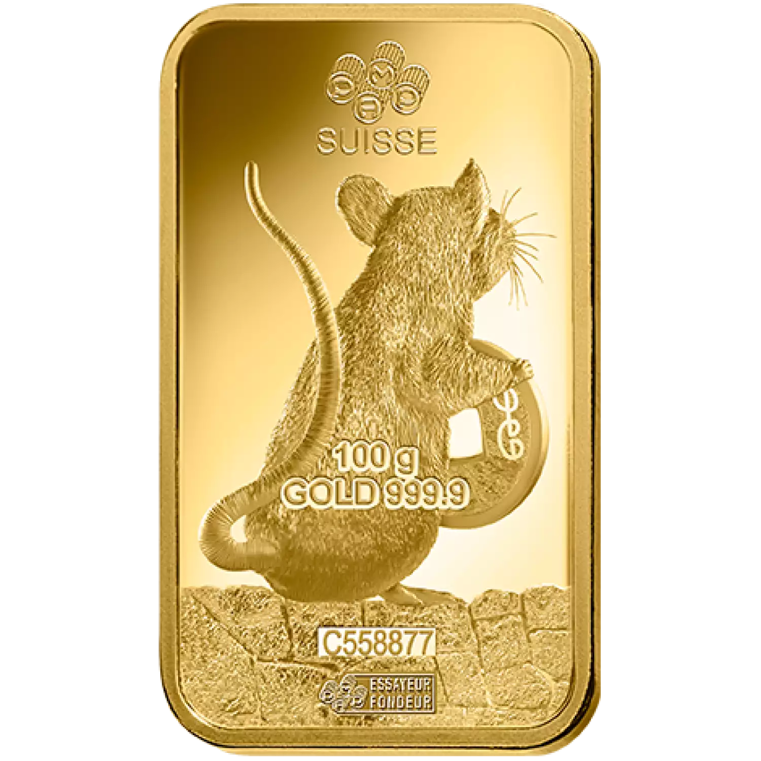 PAMP commemorates the lunar calendar by producing a new design every year. This pure gold bar's price is determined by the spot price of gold and includes the cost of manufacturing and distribution on top of it. The 100g gold bar is equivalent to 3.215 troy ounces of gold.