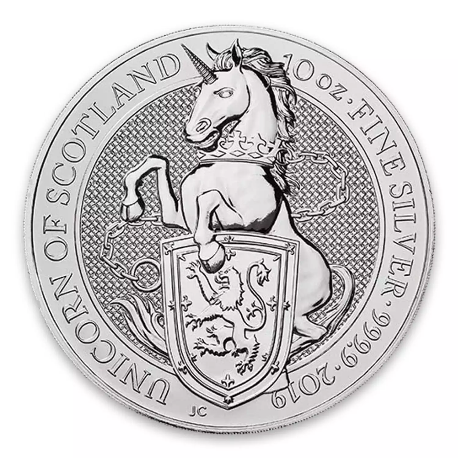 The 2019 10oz Britain Queen's Beast: The Unicorn of Scotland the fourth release in the Queen's Beasts series, featuring the Unicorn of Scotland.