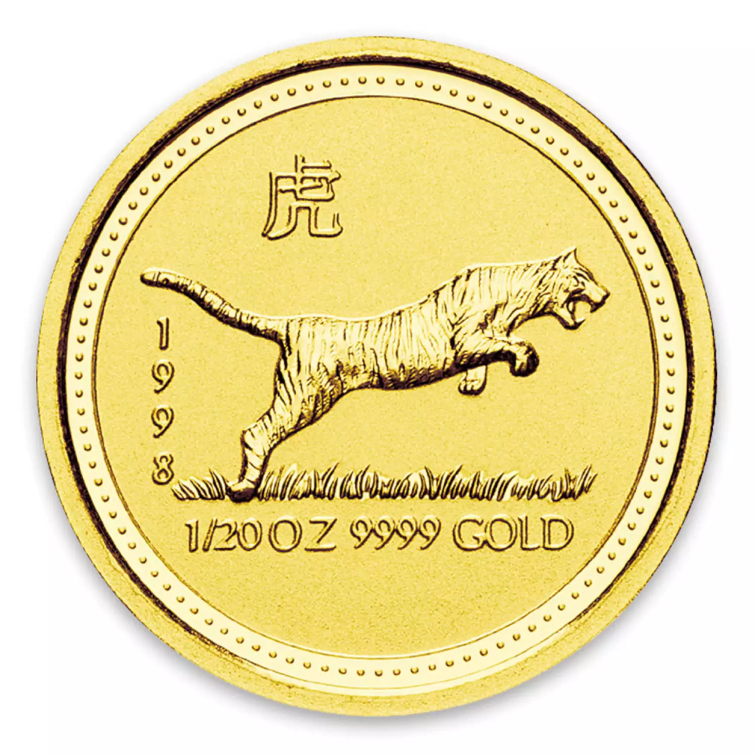 Each coin is available in 1 oz, 1/2 oz, 1/4 oz 1/10 oz, and 1/20 oz sizes. The 1998 1/20 oz Australian Perth Mint Gold Lunar: Year of the Tiger is the third release of the Series I 12-Coin series and has a mintage of just 10,427 coins.