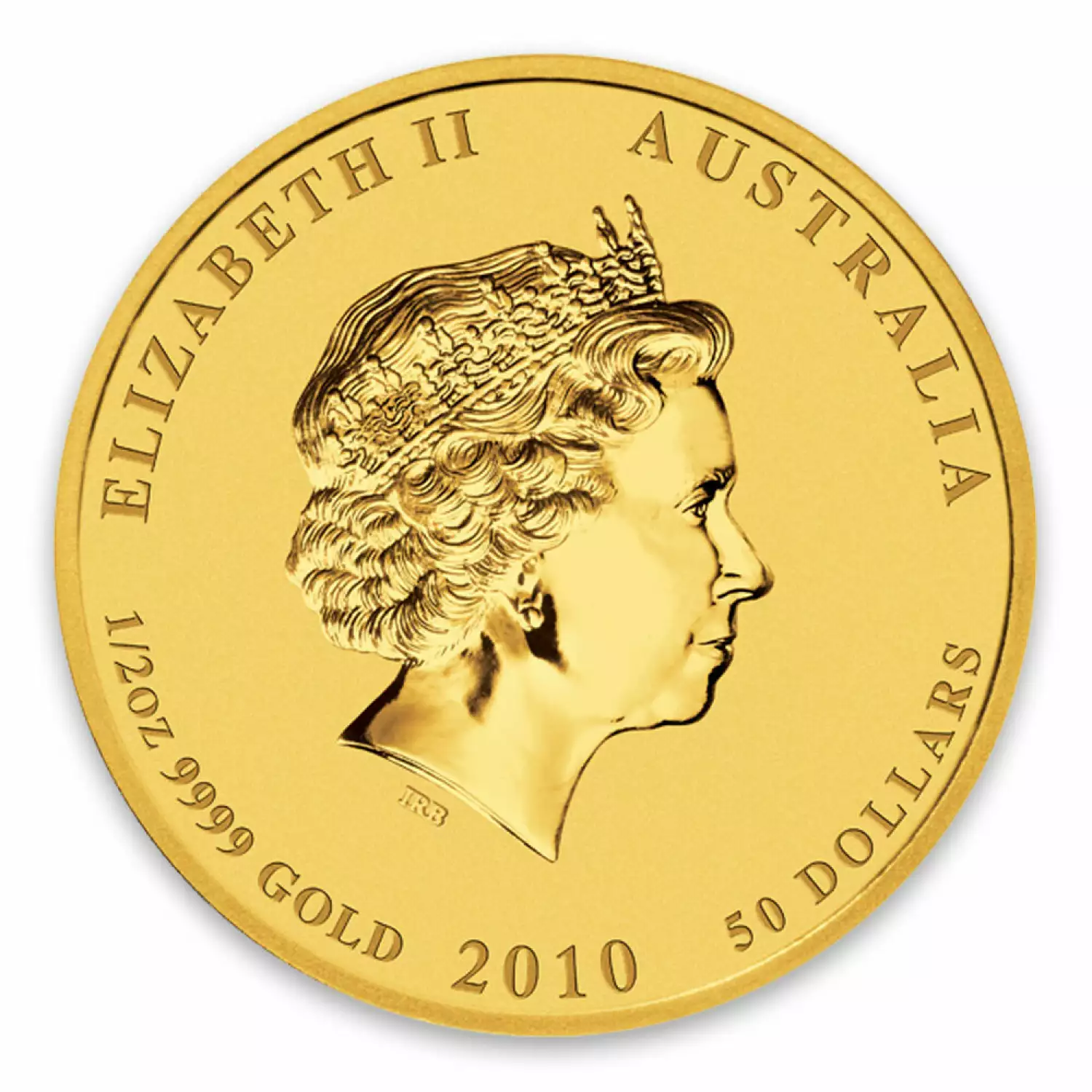The 2010 1/2 oz Australian Perth Mint Gold Lunar II: Year of the Tiger was struck by the Perth Mint in the Year 2010. This beloved coin is composed of 1/2 oz of .9999 fine gold.