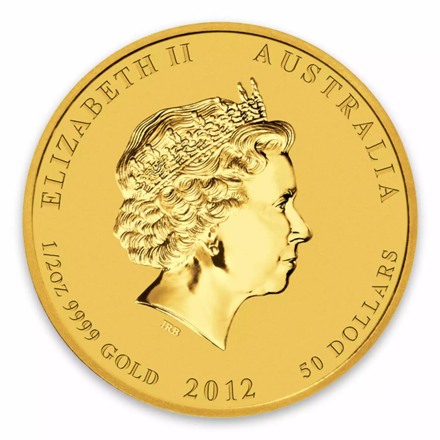 The 2012 1/2 oz Australian Perth Mint Gold Lunar II: Year of the Dragon coins are highly anticipated around the globe. Struck from .9999 fine gold, this bullion coin weighs 1/2 troy and has a legal tender value of 50 AUD.