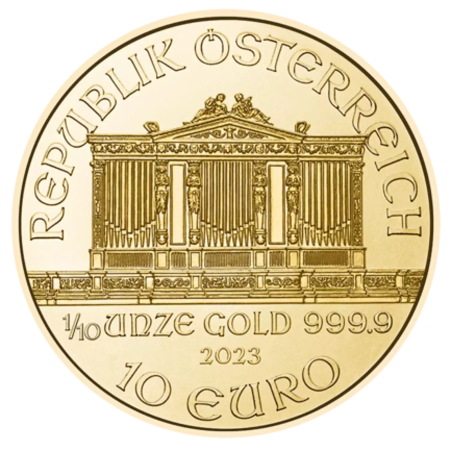 Thinking about buying gold coins from one of the reputable bullion dealers? Buy high-quality 2023 1/10 oz Austrian Gold Philharmonic online today! You can check the current gold coin price on our website.