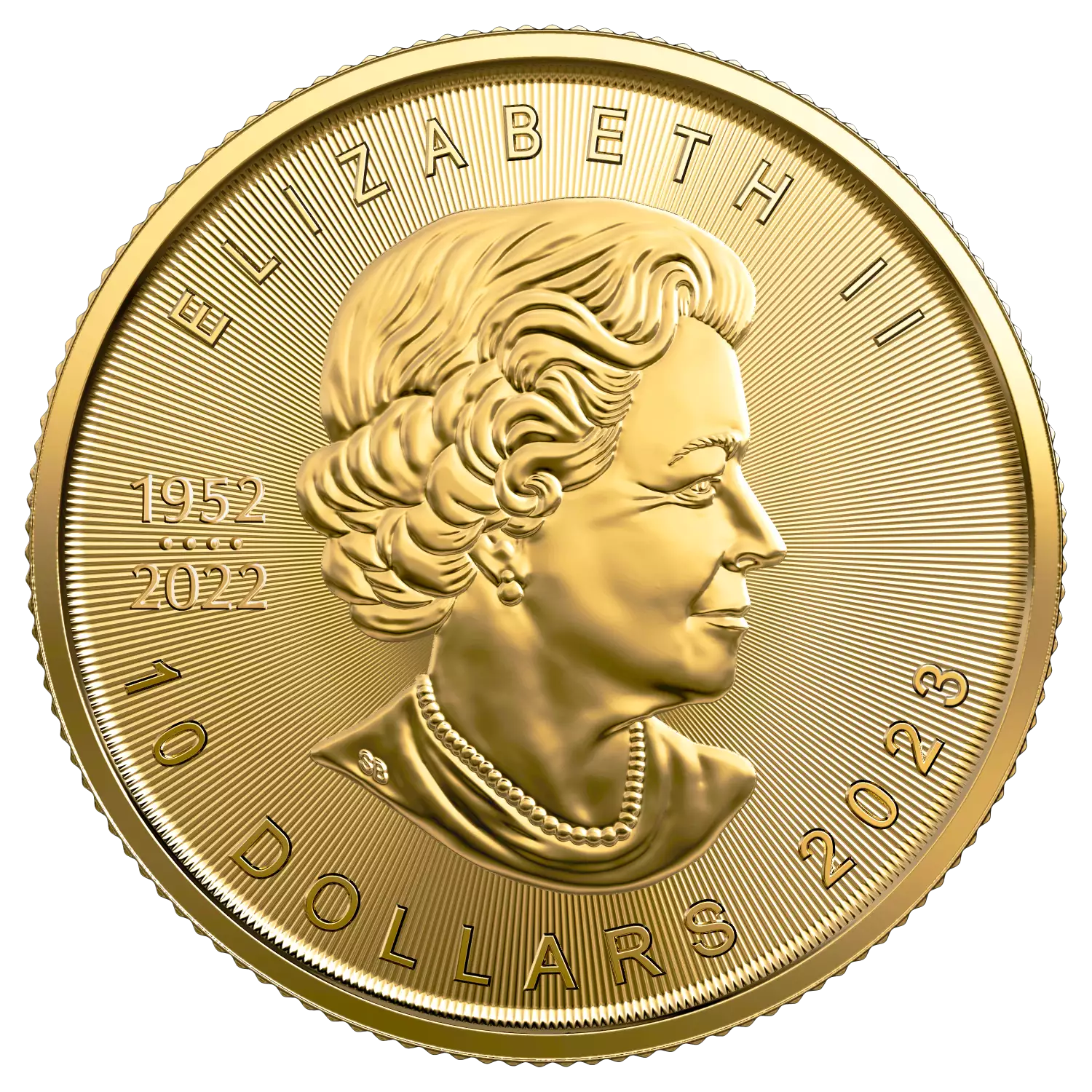 The 2023 1/4 oz Canadian Gold Maple Leaf coin contains 1/4 oz of .9999 fine Gold. The weight and purity of this coin is guaranteed by the Royal Canadian Mint. These 2023 maple leaf gold coins are highly popular among investors and collectors.