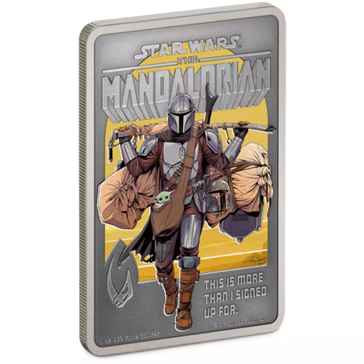 This one-of-a-kind piece features the legendary bounty hunter, Din Djarin™ (more popularly known as The Mandalorian™) displaying strength and resilience as he pushes his way forward despite the heavy baggage on his shoulders – including the adorable, yet mischievous, Grogu™! The engraved phrase ‘This is more than I signed up for’ sits alongside the Mandalorian’s Mudhorn signet – both perfectly complementing this coloured image. The addition of an engraved masthead rounds off the coin design.