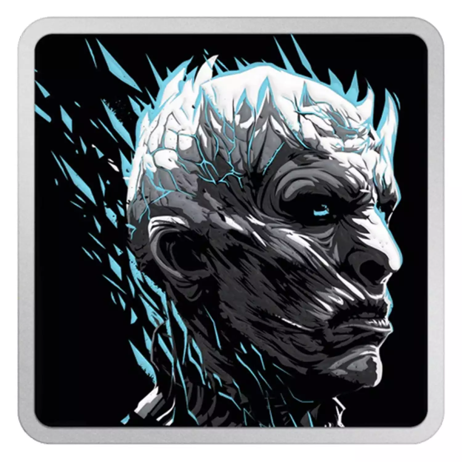 Crafted as a square badge, one side of the medallion shows a fully coloured print of the icy villain, and the other side features an engraving of his infamous name ‘The Night King.’ Engraved along the bottom, you will find the confirmation that it is 1oz of .999 fine silver and the HBO copyright for authentication.