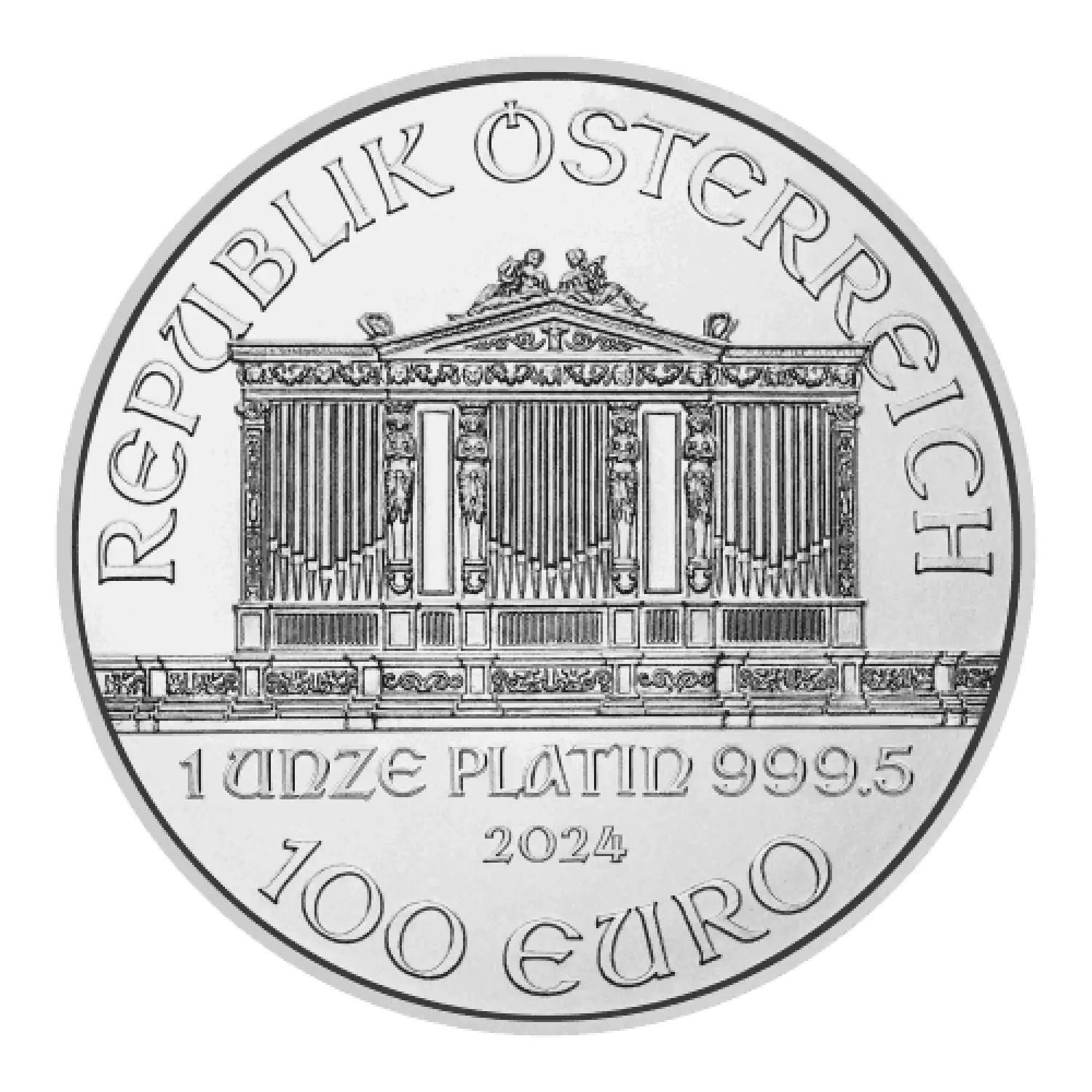 Backed by the Austrian Mint, the 2024 1 oz Austrian Platinum Philharmonic consists of 1 troy ounce of .9995 fine platinum. On the coin's obverse, you'll find a depiction of the magnificent pipe organ located in the Gold Hall of the Wiener Musikverein.