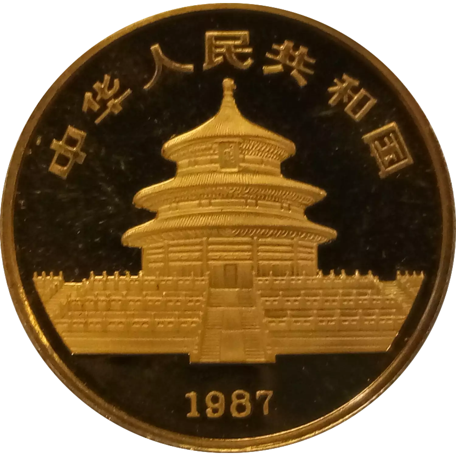 The 1987 Chinese Gold Panda coin is minted as .999 fine gold, 24 karat.