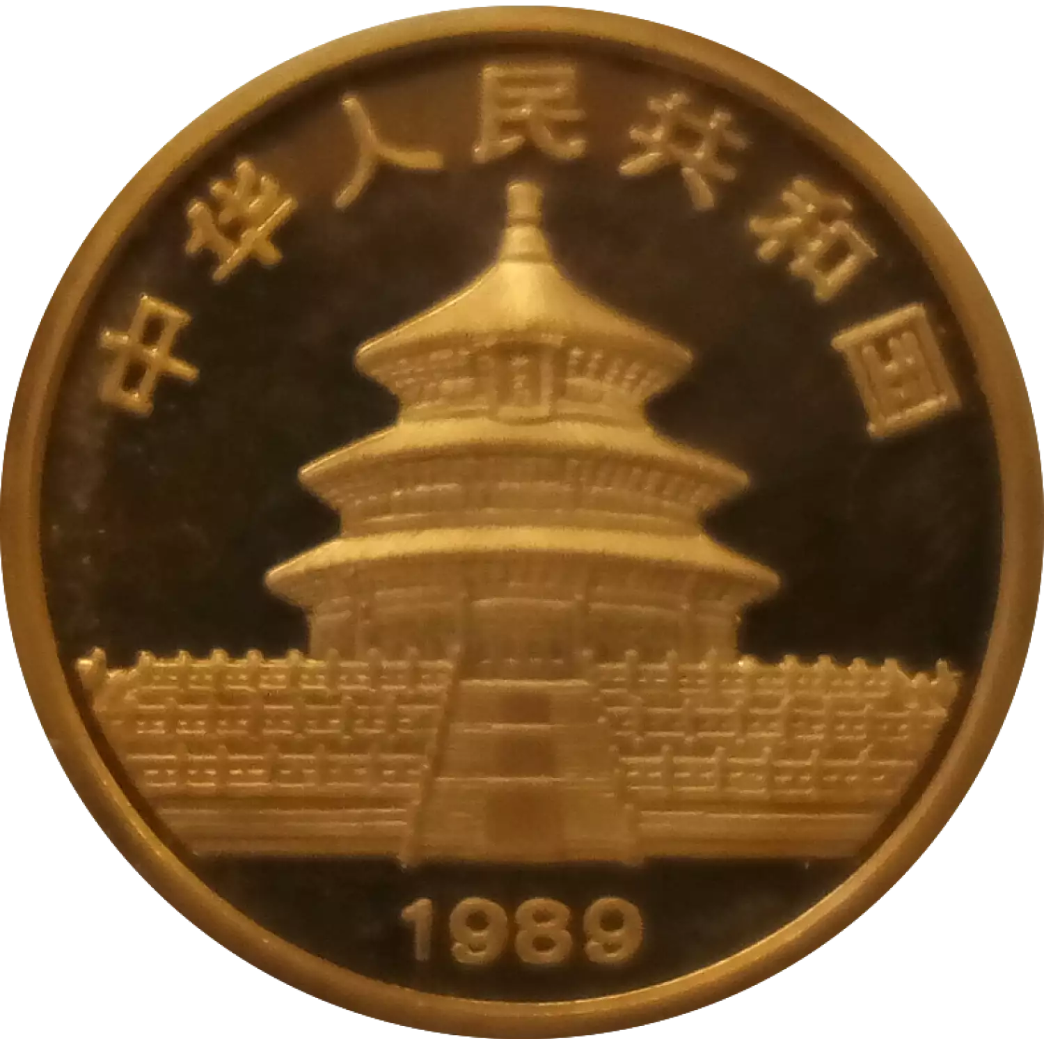 The 1989 Chinese Gold Panda coin is minted as .999 fine gold, 24 karat.