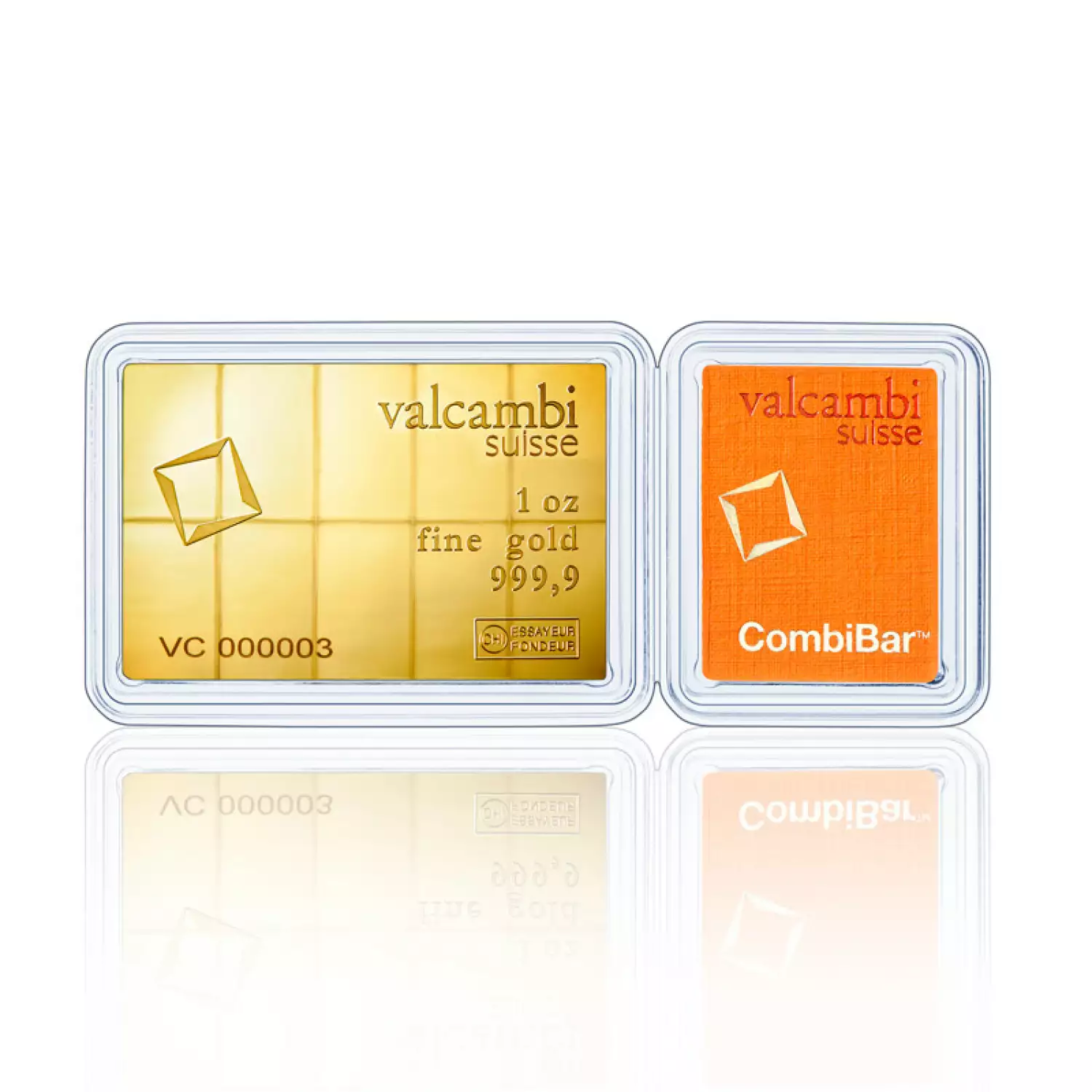The obverse of the gold combiBar depicts a single stamped Valcambi logo along with weight and purity. The reverse of the gold combiBar features the entire combination of 10 bars depicts the unique serial number, and product details.