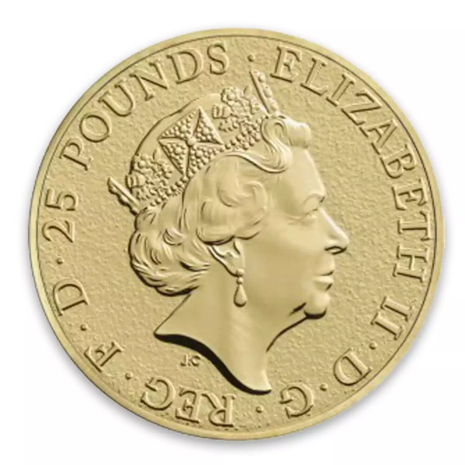 The Britain Queen's Beasts celebrate the British Monarch and the centuries of fascinating heraldry. This gold coin contains 1/4 oz of .9999 fine Gold.