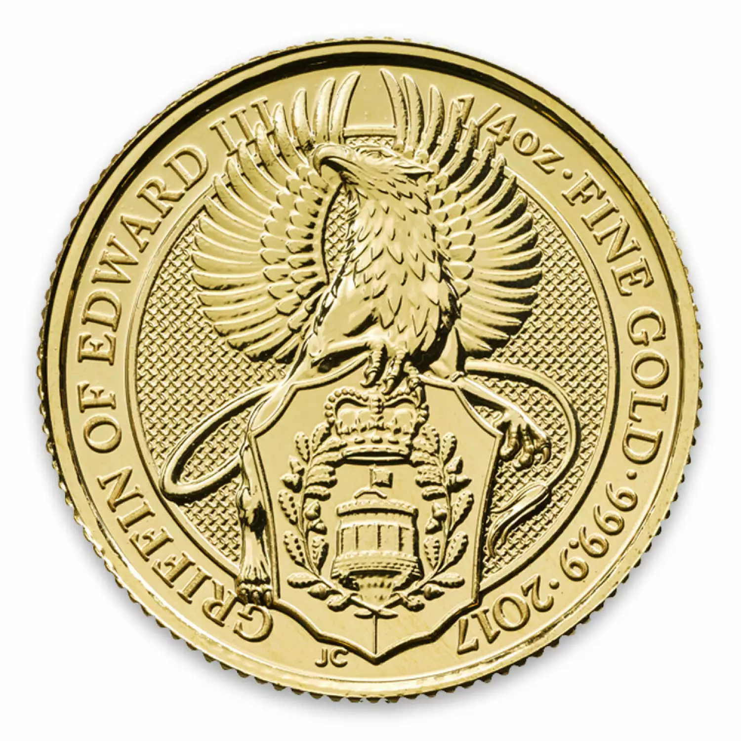 The 1/4 oz 2017 Britain Queen's Beasts: The Griffin is made of .9999 fine gold and weighs 0.25 Troy oz.